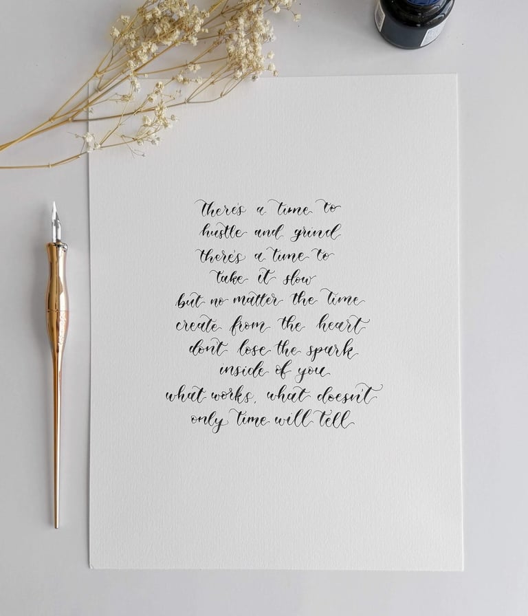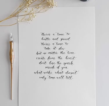 As of July 30, 2024, I’m only charging $10 to cover supplies and shipping. If someone were to commission a piece from me of the same length and give me someone else's poem/quote to write out, it would be at least $80.